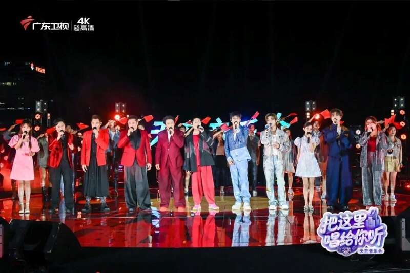 在整场音乐会中,大湾区的地域风情与人文温度,在歌声里化作鲜活图景。《Hello 大湾》展现粤港澳三地风情,《你会爱上我》是藏着在湾区生活的小确幸,《深圳欢迎您》向全世界发出来自大湾区的诚挚邀请,《春风化岭南》诉说着岭南水乡温润与粤韵绵长;《闪光》传递湾区奋进追梦力量,《无名之辈》歌颂平凡人绽放不凡,《少年派》诠释新时代青年乘风破浪的闯劲,《追光旅行》勾勒Z时代青年奔赴梦想的模样;《就是哪吒》展现非遗与流行的破壁融合,《共唱辉煌》展现香港同胞的爱国情怀,《灯火里的中国》引发全场大合唱。